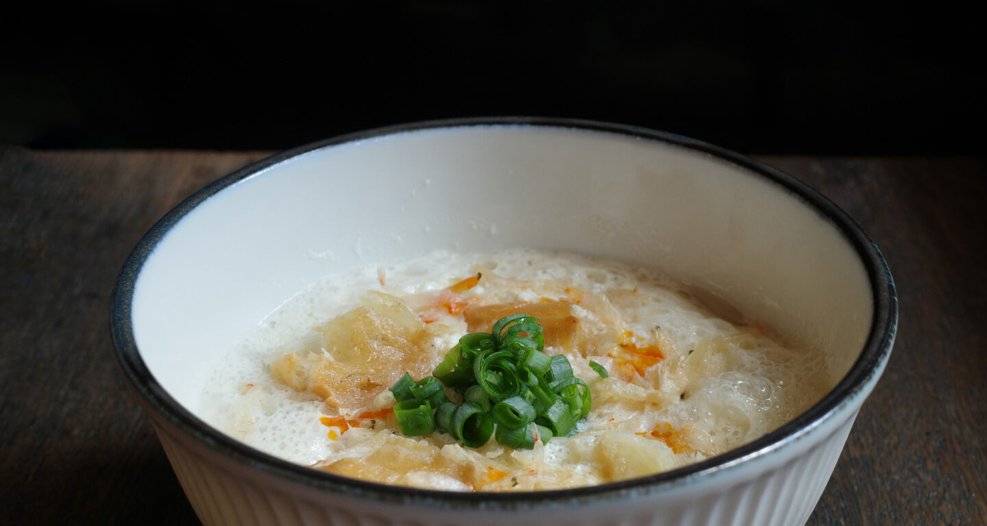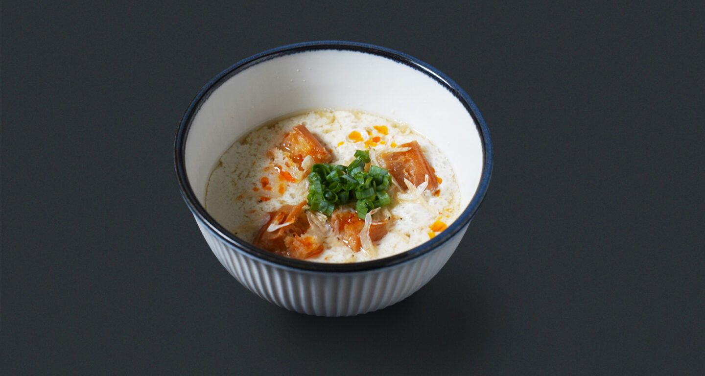 豆乳スープ 価格 500円 (税込) 台湾の朝食屋台で愛される「鹹豆漿」。 あたたかい豆乳を酢で優しくおぼろ状に固め、アミエビやザーサイ、揚げパンをトッピング。 ふるふるとした食感と優しい味わいをお楽しみいただけます。 アレルギー情報 アミエビ このメニューをシェア 大根餅 一覧へ 3色水晶餃子