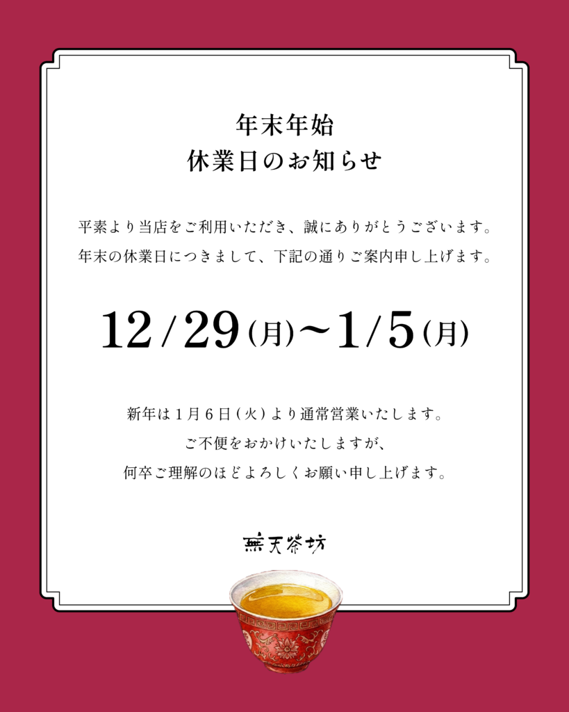 お知らせ - お知らせ - 2025.12.11 お知らせ 年末年始の営業について 平素は当店をご利用いただき、誠にありがとうございます。 当店では 2025年12月29日(月)~2026年1月5日(月)の期間、 年末年始の休業日とさせていただきます。 このお知らせをシェア 2025年12月 休業日・胡椒餅販売日のお知らせ 一覧へ