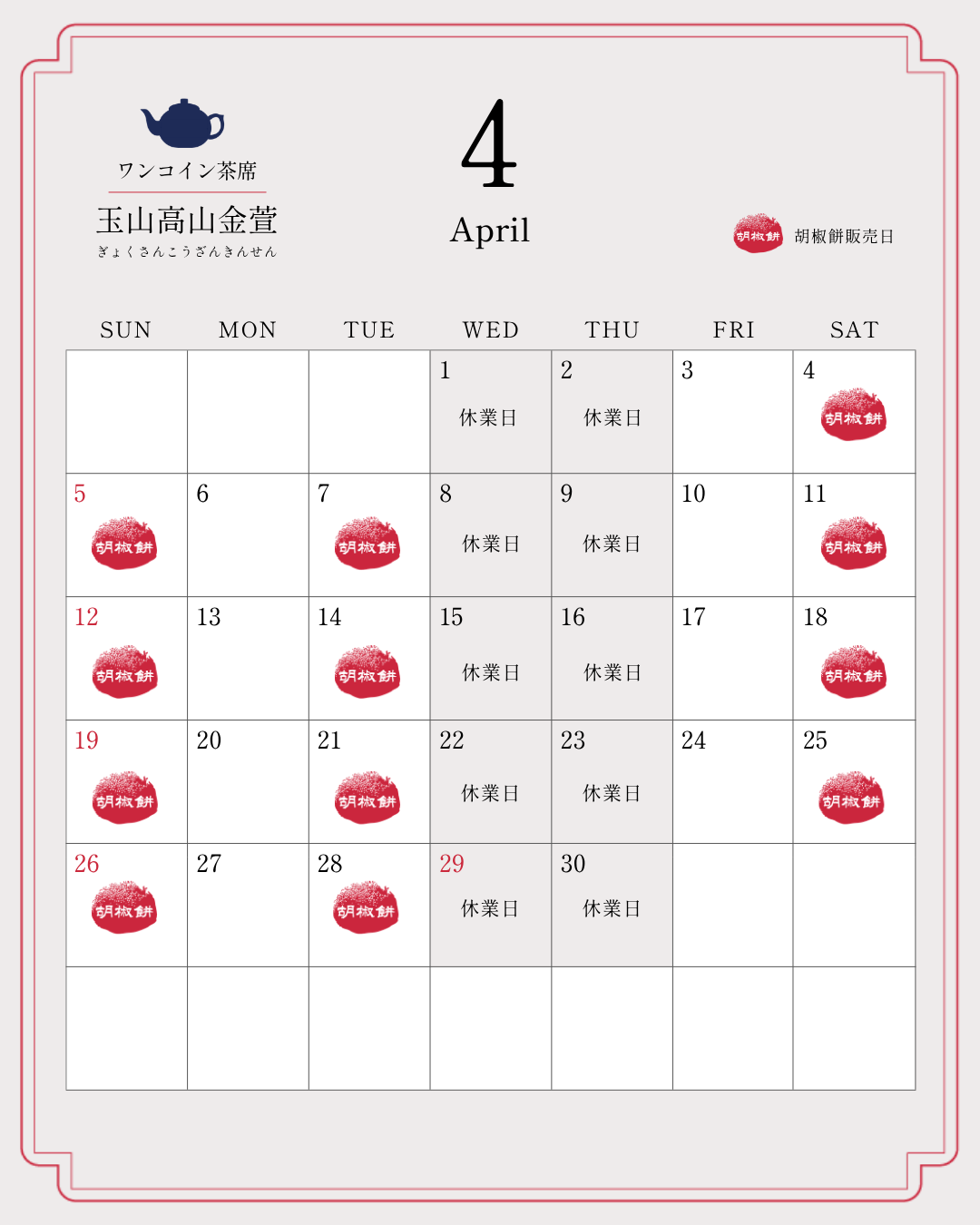 2026年4月 休業日・胡椒餅販売日のお知らせ
