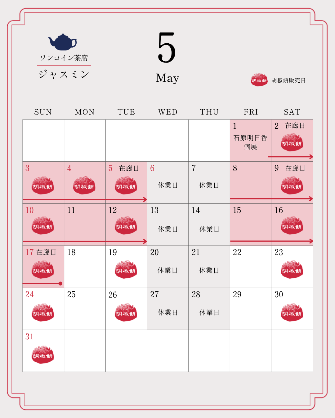 2026年5月 休業日・胡椒餅販売日のお知らせ